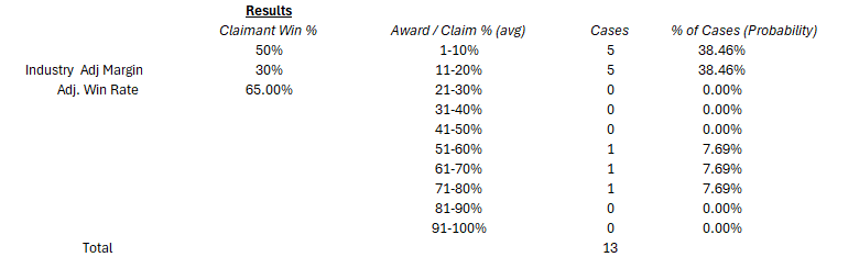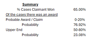Using past ICSID cases involving Mexico, who are by default the respondent 100% of the time (ICSID is meant for investor-state disputes, and Mexico are a state), we saw the outcome of each case and gathered the following data:
