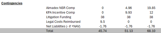 So, we can consider this an off-balance sheet receivable, already net of liabilities, contingent on the tribunal deciding to award Almaden. We can assume the market should appreciate the stock by at least $1 per $1 received assuming no speculation on future projects and their value, but that is unpredictable. We think that, for common stockholders (as opposed to options etc), the upside comes to: