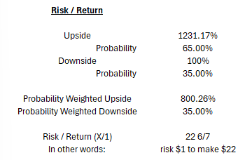 risk / return = 1 / 77, AKA risking $1 permanent capital loss for $77 upside.
