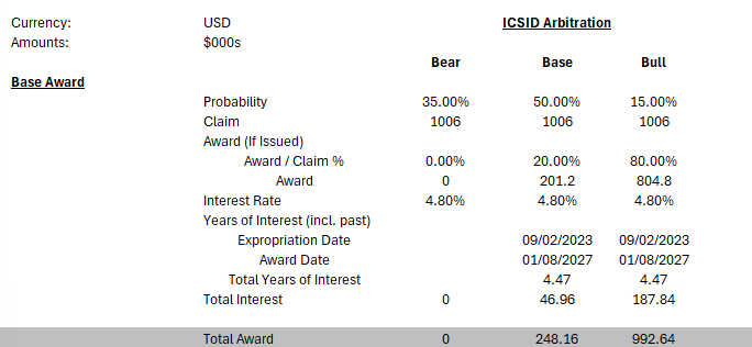 What the market is implying in the price: the market cap / award ratio, AKA the implied probability of the probability weighted award being paid, is 8% if you ignore the change in commodity price and 2.49% if you account for it. Either way, for a case of it’s merits, especially against Mexico (an expropriation-rich jurisdiction), that is too low of a probability. It would also be too low for any ICSID case - we use 20% proability weighted against ICSID avg 18%, and we used a 65% success rate against ICSID 57% average across all jurisdictions. This should demonstrate how absurd the mispricing is.