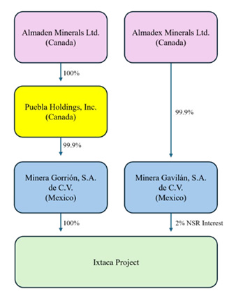 Treaty: Almaden Minerals, partnered with their spin-off Almadex submitted their memorial, which lays out the claim, on behalf of their Mexican subsidiaries Minera Gorrion / Gavilan. They have initiated a claim against Mexico under the Comprehensive and Progressive Agreement for Trans-Pacific Partnership (CPTPP, AKA ‘treaty’). Almaden suspect Mexico have breached the treaty by expropriating their investments in Ixtaca, a gold-silver project in Ixtacamaxtitlan, Pueblo, which was supposedly state of the art and in development for the last two decades. For those that don’t know, expropriation is the effective loss of economic exposure to an investment. Almaden’s ownership structure, as per the memorial, is shown below: