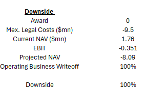 The main risk, and worst case, in any ICSID proceeding is that the tribunal decide Almaden should both not be compensated, and reimburse Mexico for their legal costs, which is compensation for wasting Mexico’s time. As we know, the risk of permanent loss of capital is 35%.