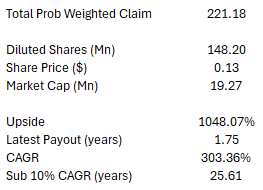 So in essence, weighted by probability, there’s a 65% chance of c.1000% upside net of all liabilities / contingencies, and a 35% chance of losing all your money. However, as we have written off the value of the other potential projects financed by the award, it’s very unlikely the market will value the company at zero, but we do it in the downside scenario for margin of safety. This is effectively, at a very conservative level, risking $1 to make $22. We see this an excellent tradeoff, and a statistically responsible investment.