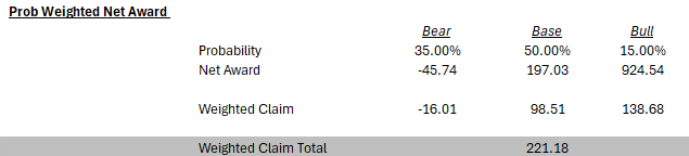 However, there’s significant margin of safety here - we could receive 10% of the probable award and still double our money.